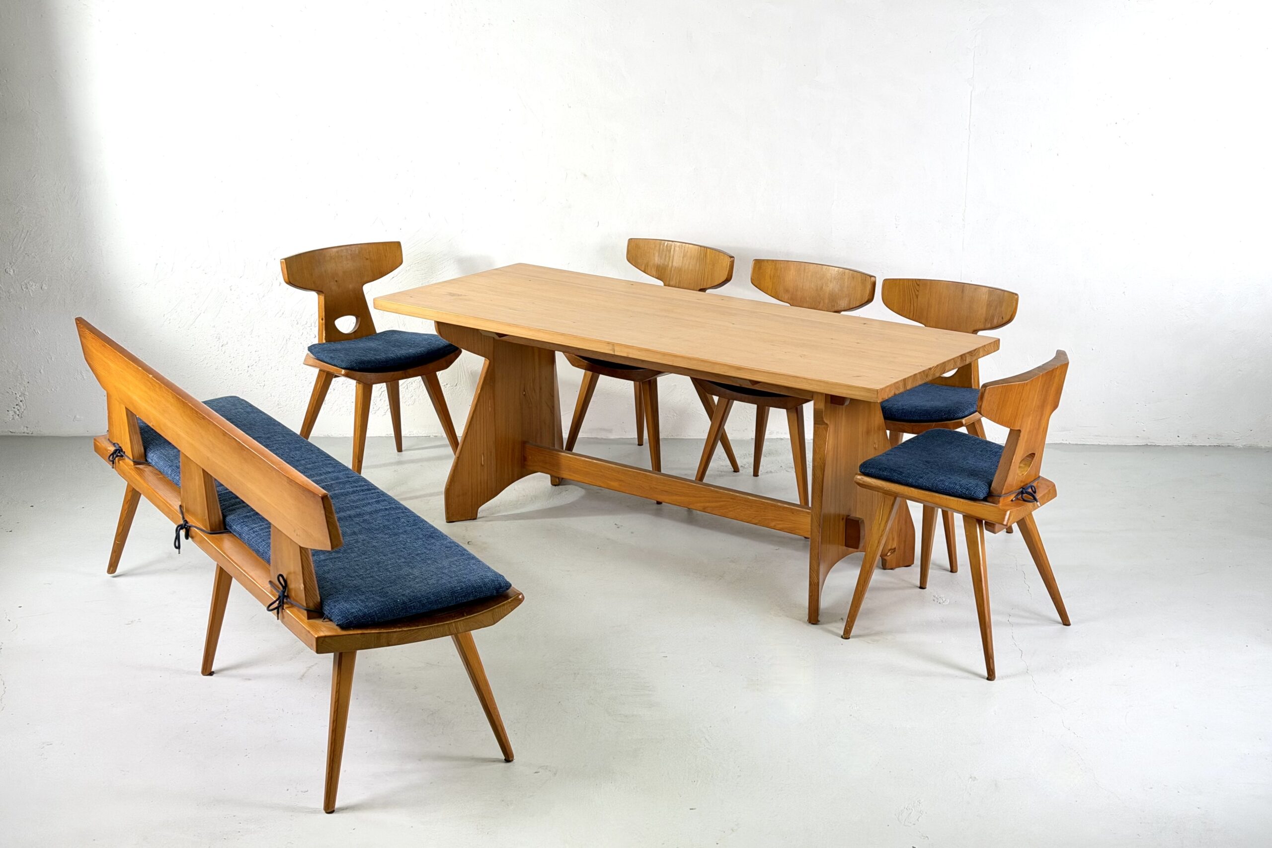 Ce magnifique ensemble est composé de 5 chaises, un banc et d’une table en pin massif.
